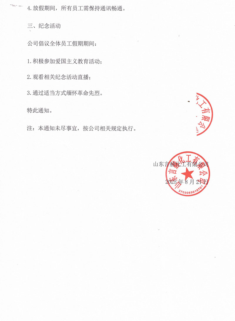 為紀念中國人民抗日戰(zhàn)爭暨世界反法西斯戰(zhàn)爭勝利80周年,根據(jù)國務院相關(guān)通知精神,結(jié)合公司實際情況,現(xiàn)將放假安排通知如下: